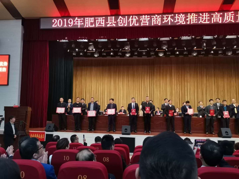2019年3月30上午9:00整,肥西县创优营商环境推进高质量发展大会在县政府派河剧场隆重召开,并举行了“肥西县优秀企业”、“优秀企业家”颁奖典礼。集团公司董事长曹张伯先生获“肥西县优秀企业家”荣誉称号。