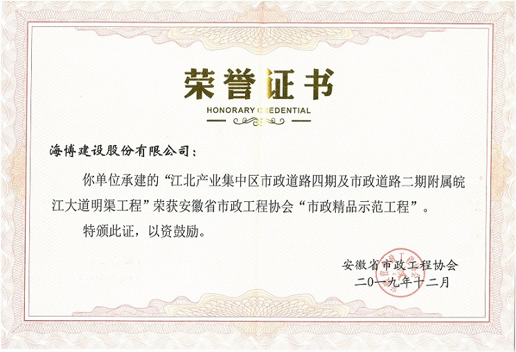 安徽省市政精品示范工程是我省市政行业给予企业管理的极高荣誉,对于市政行业管理有重要的标杆引领意义,该项荣誉的获得,是对我司长期坚持“精细化管理,创精品工程”项目管理工作的充分肯定,也是我司一直秉承“永远致力于提供更好对产品和服务,持续为客户创造更大价值”经营理念的充分体现,树立了企业的良好形象。