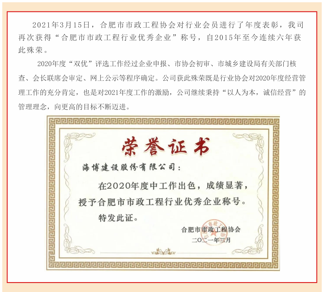 公司再获合肥市市政工程优秀企业称号