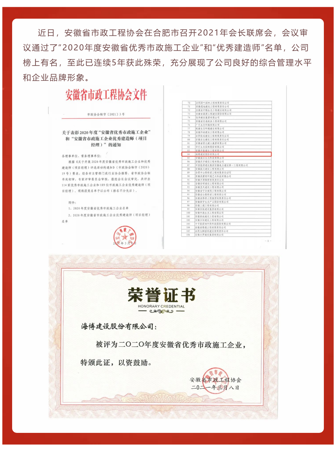 热烈祝贺公司再获省优秀市政施工企业称号